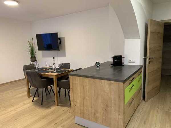 Wohnküche mit bequemer Couch, Esstisch, Garderobe, Flat-TV