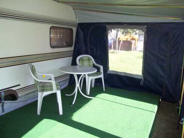 Vorzelt mit Podest, Stuhl, Tisch, Kühlschrank, Kaffeemaschine, Toster, Wasserkocher, Bratpfanne, Kochtöpfe, Teller, Besteck, Tassen, Reinigungsmitel, Doppel-Schlafmatratzen bis 140kg Mittel oder Hart bezogen mit Spann Lacken und zwei kleinen Kopfkissen, 2 Flammig Gas bzw. Elektro Herd, Waschgelegenheit mit kleinem selbst zu befüllenden Tanksystem