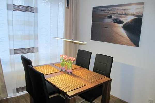 Im Wohn-/Essbereich finden Sie eine moderne Schrankwand mit LCD-TV, DVD Player und Spielekonsole. Die gemütliche Eckcouch lädt nicht nur zum Sitzen und Verweilen, sondern bei Bedarf auch zum Schlafen ein. Die hochwertige Nolte Einbauküche mit Geschirrspüler, Mikrowelle, Cerankochfeld und Backofen sowie ein geschmackvoller Esstisch runden das Gesamtbild ab.