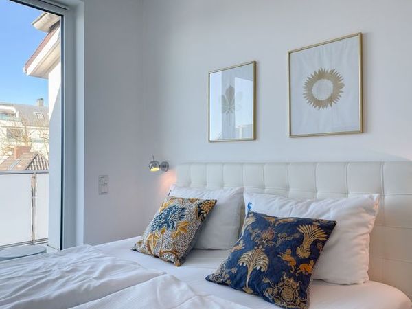 Das Penthouse bietet zwei separate Schlafzimmer mit vorgelagerten Dachterrassen, als private Rückzugsorte. Sie verfügen über Boxspringbetten (160x200),[nbsp] Einbauschränke und TV. Der großzügige Wohn- Essbereich präsentiert sich stilvoll und modern. Das Sofa ist mit einer Schlaffunktion (160x200) ausgestattet. Viel Licht und zeitgemäßer Luxus schaffen eine Atmosphäre zum Wohlfühlen. Die hochwertige Küche genügt höchsten Ansprüchen und verfügt neben allen technischen Geräten auch über einen eingebauten Weinkühlschrank. Das Designbad ist mit einem Doppelwaschbecken und einem großzügigen Duschbereich mit Rainshower und Handbrause ausgestattet. Im Einbauschrank ist eine Waschmaschine untergebracht. Ein weiteres Gäste WC steht ebenfalls zur Verfügung.