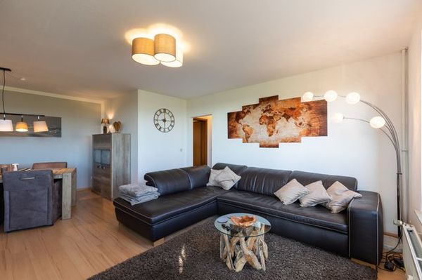 Die modern eingerichtete 3 Raum Wohnung, mit einer Größe von ca. 75 m² Wohnfläche, ist komplett bis zu 4 Personen ausgestattet. 1 Wohnzimmer mit Essplatz, gemütlichem Sofa, TV und Zugang zum Balkon, Schlafzimmer 1 mit Doppelbett und TV, Schlafzimmer 2 mit Doppelbett, Kleiderschrank und TV, innenliegendes Dusch-/Wannenbad mit WC, Gäste WC, Flur und Küche (4 Platten Cerankochfeld, Backofen, Kaffeemaschine, Toaster, Wasserkocher, Kühlschrank, Geschirrspüler), TV, Nichtraucherwohnung, keine Haustiere, PKW-Stellplatz ca. 100m vom Haus entfernt.
