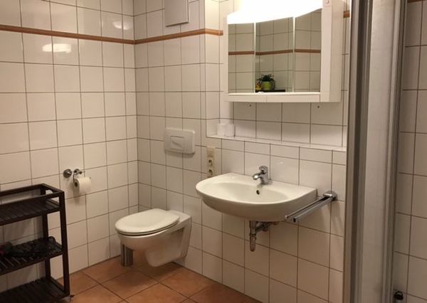 Das Badezimmer ist ausgestattet mit Dusche, WC, ausreichend Ablagemöglichkeiten und einem Föhn.