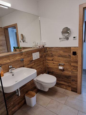 Unsere liebevoll eingerichtete Wohnung mit 2 Schlafzimmern, einem Badezimmer mit bodenebener Dusche und einem gemütlichen Ess- und Wohnzimmer ist modern und im bayrisch alpenländlichen Stil mit viel Altholz gestaltet. Die Küche ist voll ausgestattet inklusive Geschirrspülmaschine.