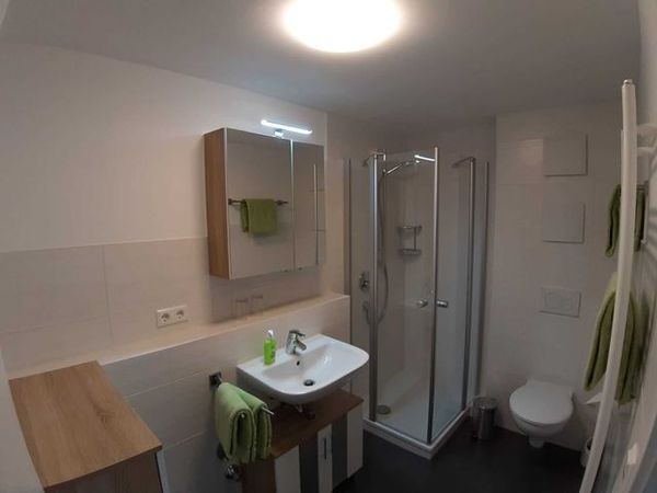 Das Bad ist ausgestattet mit Dusche/WC, Lüftung, Kosmetikspiegel, Haartrockner und Toilettenpapier.