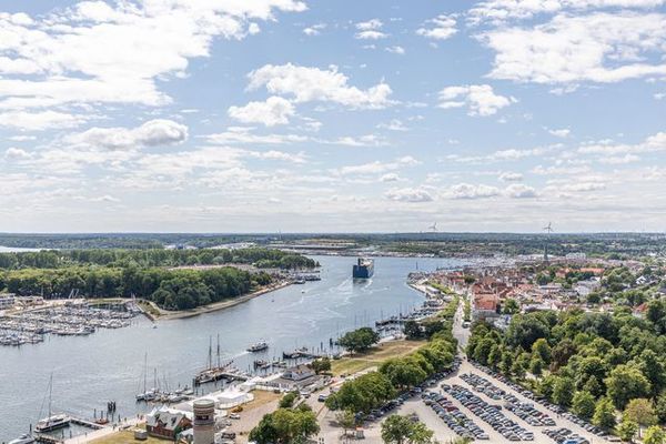 2-Zimmer-Eck-Appartement, 22. OG, ca. 72 m² mit Trave- und Meerblick. Umlaufende Loggia von ca. 21 m², Markise, Küche, Geschirrspüler, Mikrowelle, Vollbad/WC, Fön, Waschmaschine, 2x TV, Stereoanlage, kostenl. W-Lan, Safe, Aufzug, inkl. Tiefgaragenstellplatz (Einfahrtshöhe: 1,85 m). Dieses komfortable und elegante Appartement bietet ein Wohnerlebnis für höchste Ansprüche und lädt zum Wohlfühlen und Entspannen fern des Alltags ein. Die lichtdurchflutete Wohneinheit ist mit italienischen Möbeln ausgestattet. Im pastellfarbenen Wohnraum stehen eine zweiteilige Couchgarnitur, ein Glastisch und ein schicker Esstisch mit Stühlen. Die offene, moderne Küche lässt keine Wünsche offen. Im Schlafzimmer erwarten Sie ein schönes Doppelbett (2x 90 cm x 200 cm) und eine Kleiderschrankwand mit integrierter Bügelstation. Elegante Dekorationen verleihen diesen Wohnräumen eine repräsentative Optik. Den sonnigen Eckbalkon erreichen Sie von beiden Wohnräumen, um den Blick auf die Lübecker Bucht, die Ostsee und die Trave mit lebhaftem Schiffsverkehr zu genießen. Wellnessangebote wie Schwimmbad, Sauna, Beauty sowie Restaurants und Cafés sind im Haus. Lage: Direkt am Strand.