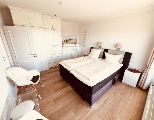 2-Zimmer-Eck-Appartement, 15. OG, ca. 72 m² mit Trave- und Meerblick. Umlaufende Loggia von ca. 21 m², elektr. Markise, Küchenzeile, Geschirrspüler, Mikrowelle, Duschbad/WC, Fön, 2x TV, Stereoanlage, kostenl. W-Lan, Aufzug, inkl. Tiefgaragenstellplatz (Einfahrtshöhe: 1,85 m). Dieses komfortable Appartement bietet ein Wohnerlebnis für höchste Ansprüche und lädt zum Wohlfühlen und Entspannen fern des Alltags ein. Der helle Wohnraum ist mit einem komfortablen elektrischen Relax-Ledersofa, einem Couchtisch und einem Relax Sessel mit Fußhocker ausgestattet. Darüber hinaus ergänzt ein Esstisch mit bequemen Stühlen und ein schicker Vitrinen Schrank den Wohnbereich. Die Küchenzeile ist im Wohnraum integriert. Im Schlafzimmer befinden sich ein Boxspringbett (2 x 100 cm x 200 cm) und ein geräumiger Einbaukleiderschrank. Das moderne Bad mit vielen Extras ist einzigartig und verfügt über eine großzügige bodentiefe Dusche mit Glasabtrennung. Den sonnigen Eckbalkon erreichen Sie von beiden Wohnräumen, um den Blick auf die Lübecker Bucht, die Ostsee und die Trave mit lebhaftem Schiffsverkehr zu genießen. Wellnessangebote wie Schwimmbad, Sauna, Beauty sowie Restaurants und Cafés sind im Haus. Lage: Direkt am Strand.