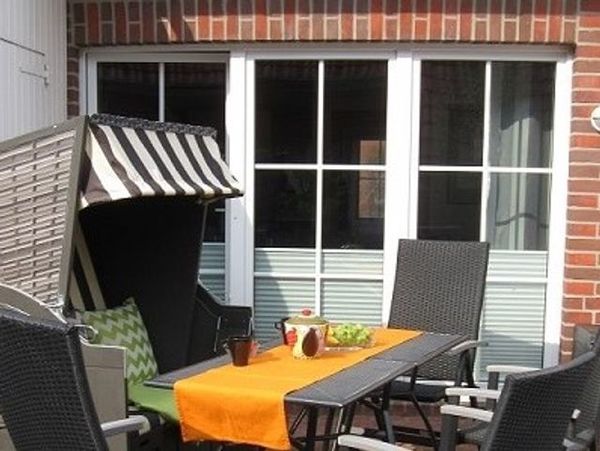 Einegemütliche Südterrasse mit Strandkorb und bequemen Terrassenmöbeln sowie mit einem Holzkohlegrill runden das schöne Ambiente ab und sorgen für einen Wohlfühlurlaub.
