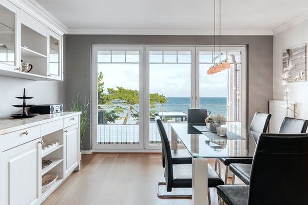 Der großzügige Balkon mit Blick auf die Ostsee ist windgeschützt und überdacht. In beiden Schlafzimmern stehen bequeme Doppelbetten und geräumige Kleiderschränke. Zusätzlich verfügen sie über Flachbildfernseher und Zugang zum Balkon Richtung Kurpark, mit Abendsonne. Die Badezimmer verfügen über große Duschen und unterfahrbare Waschbecken. Diese Wohnung ist daher auch für Rollstuhlfahrer geeignet. In einem Bad steht Ihnen eine Waschmaschine zur Verfügung.