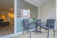 Balkonmöbel (auf dem Balkon oder in dem kleinen Abstellraum, der vom Balkon aus zugänglich ist) und Auflagen für max. 3 Personen sind vorhanden.