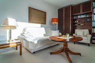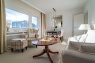 Das gut ausgestattete Wohnzimmer mit Austritt zur Südloggia hat eine bequeme Sitzecke, einen separaten Essplatz, einen Flachbild-TV.