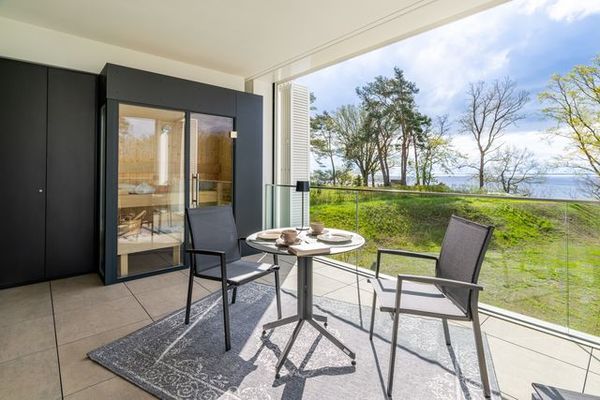 Das barrierefreie, in 2023/24 erbaute Apartment mit 109 qm mit Lanai und Haffblick im ersten Obergeschoss verfügt über kostenfreies WLAN, zwei Schlafzimmer (Platz für vier Personen plus Kleinkind im Babybett), ein Wohnzimmer, drei internetfähige Flachbild-TVs, eine voll-ausgestattete Küche mit Kühl- und Gefrierschrank, Backofen und Mikrowelle sowie Weinkühlschrank. Im Hauptschlafzimmer steht ein großes Doppelbett (180 x 200 cm), während das andere Schlafzimmer ein Schlafsofa mit einer vollwertigen Federkernmatratze (160 x 200 cm) bietet. Die beiden Badezimmer sind mit einer ebenerdigen Dusche ausgestattet, ein Badezimmer ist im en Suite-Style. Zusätzlich befindet sich auf dem Balkon mit idealer Süd-Ausrichtung eine eigene private Sauna. Handtücher und Bettwäsche sind im Preis enthalten, ebenso die Nutzung einer wohnungseigenen Waschmaschine. Zudem wird ein Sauna-Set mit kuscheligem Bademantel sowie einem Saunahandtuch angeboten.