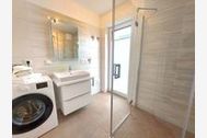 Das Badezimmer der Wohnung besticht durch klare Linien und hat eine ebenerdige Dusche sowie eine Waschmaschine.