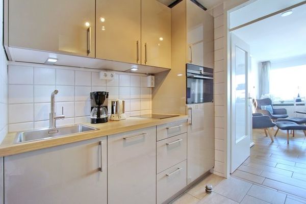 Wohlfühloase im Beach House Look im Haus Sylter Welle in der 8. Etage. Diese Einzimmerwohnung verfügt über ein feststehendes Boxspringbett mit 1 durchgehenden Topper, 2 Fernsehsessel mit Fußhockern, einen Essplatz mit 2 Stühlen am Fenster, eine Kommode und einen Kleiderschrank. Stauraum für Ihre persönlichen Dinge ist reichlich vorhanden. Auf dem Westbalkon mit direktem Meeresblick gibt es einen Tisch und 2 Hochlehnerstühle. Hier können Sie jeden Abend den Sonnenuntergang genießen. Das Badezimmer verfügt über eine breite Dusche mit niedrigem Einstieg, einen Handtuchtrockner, Fön, einen Duschhocker und einen mobilen Haltegriff. Um sich selbst zu verpflegen gibt es im Flur eine kleine Küchenzeile mit Backofen, Geschirrspülmaschine und 2-Platten-Ceranfeld. Im Flur und Bad wurden Fliesen verlegt, der Wohnraum hat einen Designboden in Holzoptik. Auf Teppiche wurde ganz verzichtet. Zur technischen Ausstattung dieser Nichtraucherwohnung gehört: ein Flachbildfernseher von Panasonic und eine Radio mit CD Player. Den kostenfreien WLAN Zugang (Haus Sylter Welle) können Sie gerne nutzen. Wohnungsgröße: ca. 34 m².