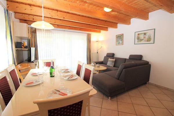 Erdgeschoss liegt der großzügige Wohnraum mit bequemer Doppelbettcouch, separater Essbereich, Kabel-