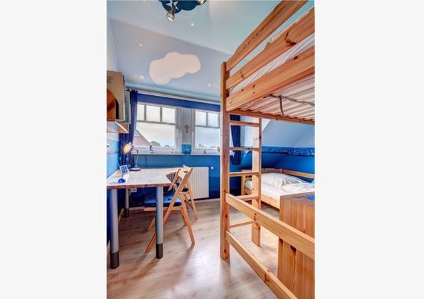 Über eine Holztreppe erreichen Sie das Obergeschoss des Ferienhauses. Hier befinden sich die drei Schlafzimmer: zwei davon mit bequemen Doppelbetten und ausreichend Verstauraum für Ihre Habseligkeiten. Das dritte Schlafzimmer ist das Kinderzimmer mit Büchern, einem Schreibtisch und zwei Einzelbetten.