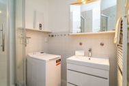 Das Badezimmer ist mit Dusche, Waschtisch, Waschmaschine und WC komfortabel eingerichtet.