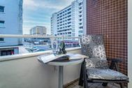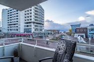 Lichtdurchflutete 2-Zimmer-Nichtraucher-Ferienwohnung (ca. 62 qm) mit modernem Designerboden in Holzoptik in der 1. Etage mit Meerblick, Westloggia (mit Balkonmöbeln und Auflagen) für max. 3 Personen.