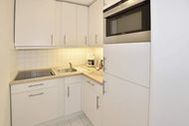 Die zum Wohnraum offene Küche hat einen Geschirrspüler, eine Mikrowelle-Backofen-Kombi, Ceranfeld (4 Felder) und einen Kühlschrank mit 3-Sterne-Gefrierfach.