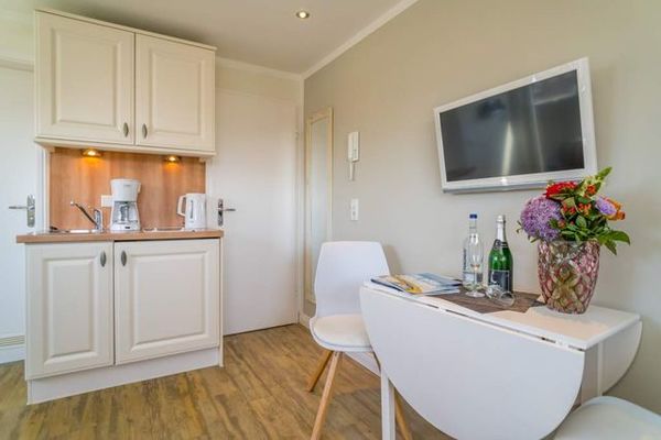 Moderne 1-Zimmer-Nichtraucher-Ferienwohnung (ca. 24 qm) in der 1. Etage mit Westbalkon (Nachmittagssonne, mit Balkonmöbel und Auflagen) für max. 2 Personen.