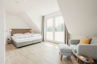 Im Obergeschoß befinden sich zwei Schlafzimmer mit jeweils einem großen, 1,80 Meter breiten, Boxspringbett und einem Kleiderschrank. Aus beiden Zimmern haben Sie einen traumhaften Blick auf die umgebende Natur und den Bodden. Das größere Zimmer verfügt über bodentiefe Fenster, ein Smart TV und einen gemütlichen Sessel.