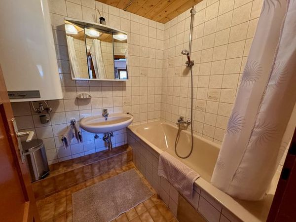 Die Wohnküche ist mit Holz- und Elektroherd sowie Spülmaschine gut ausgestattet. In der geräumigen Stube mit wärmendem Kachelofen und Fernseher können Sie den Tag gemütlich ausklingen lassen. Auch ein Bad mit Waschbecken und WC darf nicht fehlen.