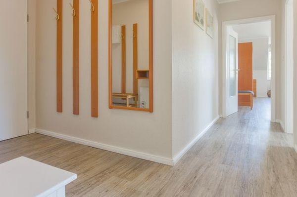 Das Apartment 13 im 2. OG bietet auf ca. 55 m² ausreichend Platzangebot für bis zu 5 Personen. Ein Schlafzimmer mit Doppelbett und großem Kleiderschrank, eine bequeme und großzügige Schlafcouch für 2 Personen im Wohnbereich, sowie eine einzelne Schlafcouch, sorgen für die nächtliche Erholung. Für Unterhaltung im Wohnbereich stehen Sat-TV, CD-Player und WLAN-Hotspot zur Verfügung. Die offene, vollausgestattete Küche mit Spüler lässt nichts vermissen und bietet Ihren kulinarischen Wünschen viel Spielraum. Ein kleiner Essbereich ist in der Küche vorhanden. Der Essbereich für die große Runde im Wohnzimmer. Das helle und moderne Duschbad mit Fön, Rasierspiegel, Handtuchwärmer und Dachfenster, bietet Ihnen einen weiteren Wohlfühlfaktor. Pflegeleichte Böden sorgen für Komfort. Eine allgemeine Waschmaschine, Trockner und Gefriertruhe sind für das gesamte Apartmenthaus kostenlos verfügbar. Im Abstellraum finden Sie zudem noch Bügeleisen, Bügelbrett und Wäscheständer. Bei Bedarf können Bettwäsche, Handtücher, Kinder-Reisebett und Hochstuhl gegen Gebühr geliehen werden. Dies ist eine Nichtraucher Unterkunft. Geraucht werden kann in der Raucherecke auf dem Parkplatz. Zur Wohnung gehört der Parkplatz Nr. 13 auf dem Grundstück. Direkt neben dem Hauseingang steht ein Unterstellraum für Räder zur allgemeinen Nutzung zur Verfügung. Der Strand ist nur ca. 1.500 m entfernt. Ein WLAN-Hotspot ist im Apartmenthaus eingerichtet (Achtung! Unterschiedlicher Empfang).