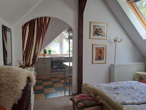 Die Wohnung (36 m²) verfügt über einen stilvoll eingerichteten kombinierten Wohn-/Schlafraum mit Möbeln im romantischen Rokoko-Stil, großem Doppelbett und gemütlicher Sitzecke sowie Balkon. Die moderne, geräumige Küche ist komplett ausgestattet mit Geschirrspüler, Mikrowelle, Elektroherd, Kaffeemaschine etc. und lädt zum gemütlichen Frühstück ein. Das in Rosa gehaltene Bad verfügt über Dusche (hoher Einstieg), Waschplatz und Toilette mit Fenster.
