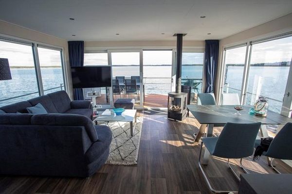Dieses schwimmende Ferienhaus hat einen offenen Wohn-, und Essbereich mit Gas-Kamin* und mit integrierter, voll ausgestatteter Küche und bietet, Dank dem dreiseitigen Glasfront, einen tollen Ausblick auf den Gräbendorfer See.