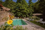 Das märchenhafte Anwesen erstreckt sich über ein 80.000 qm großes Grundstück, von dem 4 Hektar mit einem 2 Meter hohen Zaun ausbruchsicher geschlossen sind. Der große Pool auf dem Sonnendeck lässt die Herzen von Sonnenanbetern höher schlagen. Die kleinen Bächlein, die das Grundstück durchziehen, haben Trinkwasserqualität und sind bekannt für ihre Sauberkeit. Ein weiterer Swimmingpool mit Sonnenliegen befindet sich im vorderen Bereich des Hauses. Zahlreiche Hängematten wurden zwischen den Bäumen am Ufer angebracht, sodass jeder seinen persönlichen Ruheplatz finden kann. In den heißen Sommermonaten sorgt der hohe und dichte Baumbestand für ein angenehm kühles Klima. Der Bach fließt etwa 1000 Meter durch das gesamte Grundstück und bildet dabei zwei große natürliche Badebecken mit eigenen Wasserfällen, ideal zum Bauen von Staudämmen und zum sicheren Toben für Kleinkinder. Oberhalb des Hauses befindet sich ein großer Platz, der als Tennisplatz oder Volleyballfeld genutzt werden kann. Das Grundstück verfügt über sechs Parkplätze. Dank der etwa 100 cm dicken Wände benötigt die Casa nel Bosco keine Klimaanlage und bietet zu jeder Jahreszeit ein angenehmes Wohnklima.