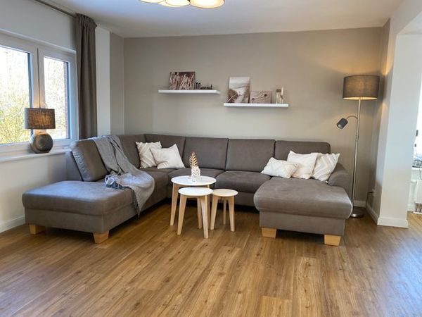 - Stilvoll und moderner offener Wohn-Essbereich mit angrenzendem Tresen und Barstühlen zur offenen und voll ausgestatteten Küche (Mikrowelle, Geschirrspüler, Tiefkühler u.v.m.) Vom Essbereich gelangen Sie direkt auf die überdachte Terrasse mit Blick in den Garten und Felder