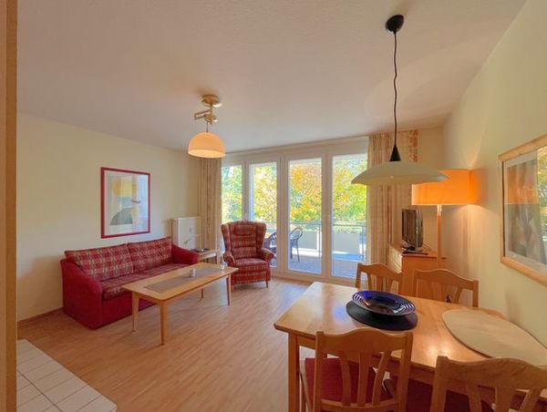 An den Wohnraum mit Schlafsofa, Flachbild-TV, Essbereich und offener Küche schließt sich der möblierte Balkon an.