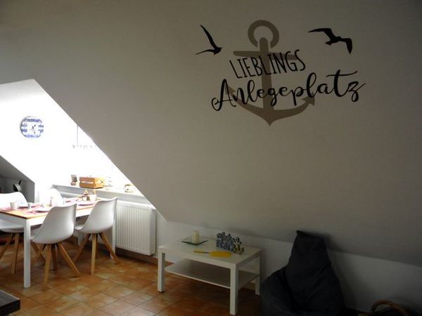 Die Ferienwohnung "Norderwarft" befindet sich im Obergeschoss des Hauses und bietet auf 70qm bis zu 4 Personen und 1 Kleinkind Platz. Es gibt zwei Schlafzimmer, einen Wohn-/Essbereich mit Küchenzeile und Schlafcouch sowie ein Duschbad. Im Garten befindet sich eine möblierte Terrasse. Kostenloses WLAN ist vorhanden und Parkplätze sind direkt vor dem Haus. Rauchen und Haustiere sind nicht erlaubt.