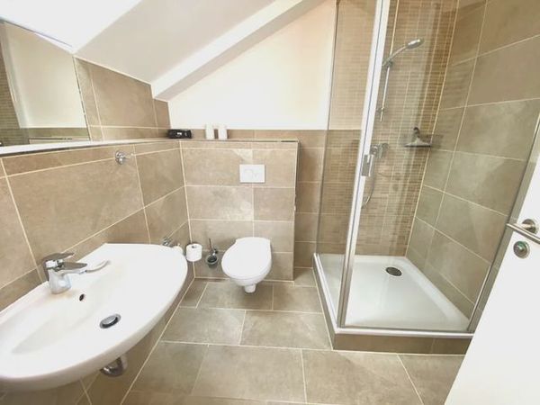 - Badezimmer mit Dusche, beheiztem Handtuchhalter und teilweise Tageslicht
