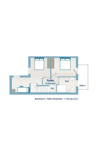 Die Ferienwohnung Achterdeck bietet Platz für bis zu sechs Personen. Sie ist auf zwei Etagen aufgeteilt. Im Erdgeschoss gibt es einen offenen Wohn- und Küchenbereich mit Essplatz und Zugang zur Terrasse. In der oberen Etage befindet sich ein separates Schlafzimmer mit einem Doppelbett sowie ein zweites separates Schlafzimmer mit einem Doppelbett und einem Etagenbett, das zwei Meter lang ist und in dem auch Erwachsene schlafen können. In der oberen Etage gibt es zudem das Badezimmer mit Dusche und WC. Zur Ferienwohnung gehört ein Balkon. Die Betten des Etagenbettes haben jeweils eine Größe von 80x200 cm.