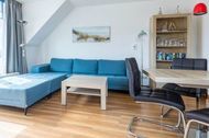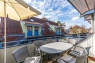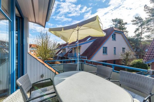 Im Wohnbereich in der ersten Wohnebene laden bequeme Möbel und Flatscreen-TV zu entspannenden Stunden ein. Der direkte Zugang zum Süd-Balkon mit Gartenmöbeln bietet herrliches Ostseefeeling.