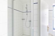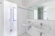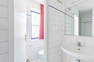 Das moderne Duschbad bietet zwei Waschtische und eine Dusche. Das WC ist im Bad separat eingerichtet. Hier sorgt ein Fenster auch für zusätzliches Tageslicht.
