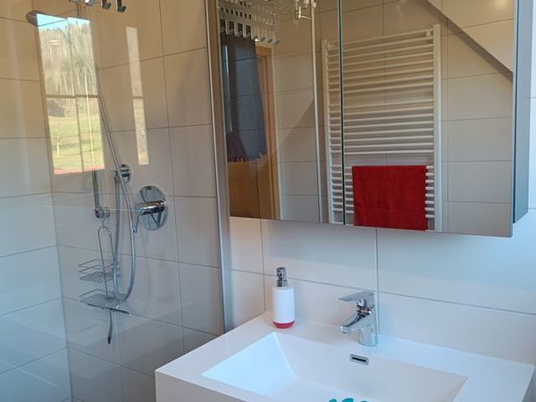 Das moderne Tageslichtbad verfügt über einen großen Waschtisch und über eine ebenerdige Dusche.