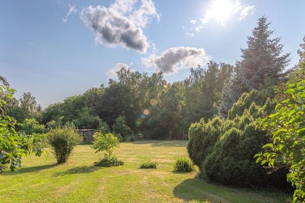 Zu dem vollständig eingezäunten 1.800 qm großen Grundstück gehört, außer der Terrasse am Haus und dem Grillplatz mit Pavillon, noch eine große, wilde Wiese, die zum Toben und Spielen,