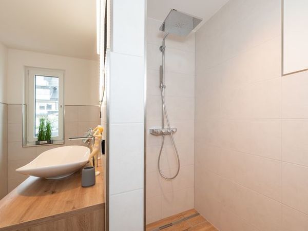 - Modernes 9 qm großes Bad mit Fußbodenheizung, große begehbare Dusche, WC, beleuchteter Spiegel, Handtuchheizkörper, Haartrockner