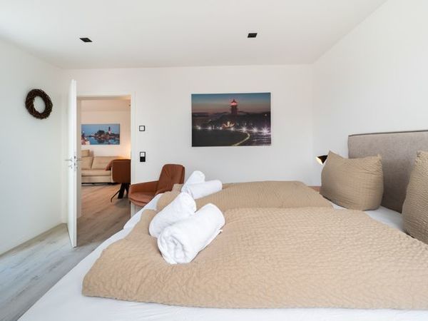 - Großzügiges Schlafzimmer mit Boxspringbett (1,80 x 2,00), großer Kleiderschrank, großer Flachbildfernseher (internetfähig), Babybett möglich, Zugang zur großzügigen Dachterrasse