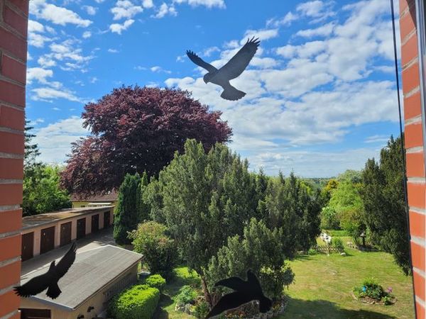 Hinter dem Haus befindet sich auf dem komplett eingezäunten Grundstück (Höhe ca. 60 120cm), der kostenlose Parkplatz, ein großer Garten mit Wiese (Auslauf für die Hunde), Gartenmöbeln und einen Grillplatz, der gerne mitgenutzt werden kann.