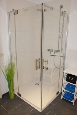 - Badezimmer mit Dusche, WC, großen Spiegelschrank