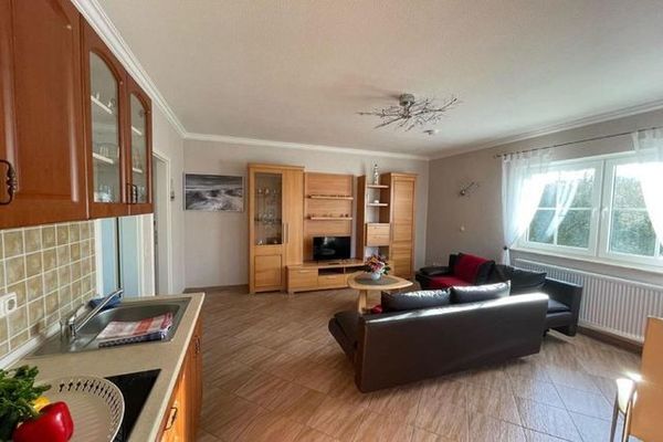 Die Wohnung bietet einen offenen Wohnbereich mit zwei bequemen Schlafcouchen (Aufbettungsmöglichkeit für 3. & 4. Person mit je einer Liegefläche von 190x120cm) und einem Flat-TV. Außerdem finden Sie hier eine komplett eingerichtete Küchenzeile mit Kühl-Gefrierkombi, Cerankochfeld, Wasserkocher, Kaffeemaschine, Toaster und Mikrowelle mit Grillfunktion sowie einen Esstisch mit Stühlen für bis zu 4 Personen.