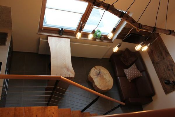 Das 25 qm große Appartement besticht durch den besonderen Charme eines rustikalen Tiny Houses. Auf kleinem Raum mit zwei Ebenen befinden sich der Wohn-/Essbereich mit Küche, sowie ein Schlafbereich mit Doppelbett.