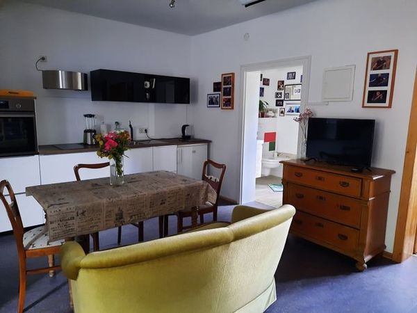 Ein gemütliches 140er Schlafsofa, eine voll eingerichtete Küchenzeile mit Essecke und Sitzsofa, einem Fernseher und einem hübschen Bad. Auf Anfrage steht ein DVD-Player sowie Filme aus der umfangreichen hausinternen DVD-Sammlung zur Verfügung. Kostenfreies W-Lan sowie Bett- und Badwäsche sind enthalten, das Auto kann ggf. direkt vor der Haustür geparkt werden. Für Fahrräder steht ein von fast allen Seiten abgeschlossenes Carport zur Verfügung.