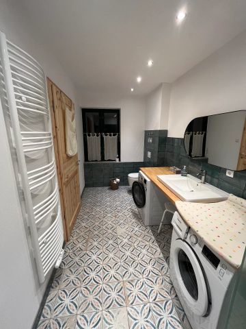 Das geräumige Badezimmer bietet eine ebenerdige Dusche, WC, Waschmaschine und Trockner und Wickelplatz.
