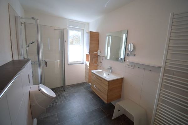 Die moderne Drei-Zimmer Wohnung liegt im ersten Stock unseres Hauses. Die Wohnung ist mit 82 qm perfekt für einen Urlaub zu viert. Es sind zwei Schlafzimmer mit jeweils einen großen Doppelbett (200 cmx 200 cm) vorhanden. Besonderes Highlight im Schlafzimmer sind die Nachttischlampen mit verschiedenen Lichtstimmungen, je nachdem, ob Sie helles Licht zum Lesen benötigen oder ein warmes Licht zum Relaxen. Die Schlafzimmer lassen sich für besonders erholsame Nächte komplett verdunkeln. Die große Küche ist ausgestattet mit Kühl- und Gefrierschrank, Spülmaschine, Kaffeefiltermaschine, Wasserkocher, Toaster und Eierkocher und vieles andere, was Sie zum Kochen brauchen. Der Wohnbereich bietet sehr viel Platz um sich in Ruhe gemütlich zu entspannen. Das Badezimmer verfügt neben dem WC über ein Urinal und eine ebenerdige Dusche mit mobilen Duschsitz. Auf dem Balkon lässt es sich in der Morgensonne mit einem Blick auf den Nationalpark und das Vorstaubecken des Edersees gut frühstücken.
