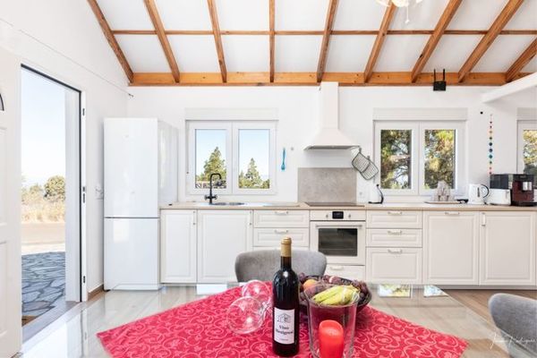 Das Ferienhaus Mesigresi bietet einen hellen Wohnraum mit hohem Holzdach, offener, moderner Küchenzeile, Essplatz und Schlafcouch. Im Schlafzimmer mit Fußbodenheizung finden Sie ein bequemes Doppelbett, das Bad mit großer Dusche und großem Fenstern mit Blick auf Kiefernbäume schließt sich an. Ein weiteres Schlafzimmer bietet bequem Platz für 1 Person, dazu gehört ein Bad mit Waschtisch und WC. Alternativ gibt es eine bequeme Schlafcouch im Wohnzimmer.