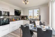 Die Küchenzeile verfügt über hochwertige Geräte wie Herd, Backofen, Mikrowelle, Kühl- und Gefrierschrank sowie Spülmaschine. Ausreichend Geschirr, Besteck sowie Töpfe und Pfannen befinden sich in den Schränken. Am großen Esstisch finden Sie vor einem erholsamen Urlaubstag zu einem gemeinsamen Frühstück zusammen.