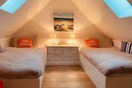 Obergeschoss: 1 Schlafzimmer mit Doppelbett, Kleiderschrank und zusätzlichem TV, 1 Schlafzimmer mit Doppelbett und zusätzlichem TV.